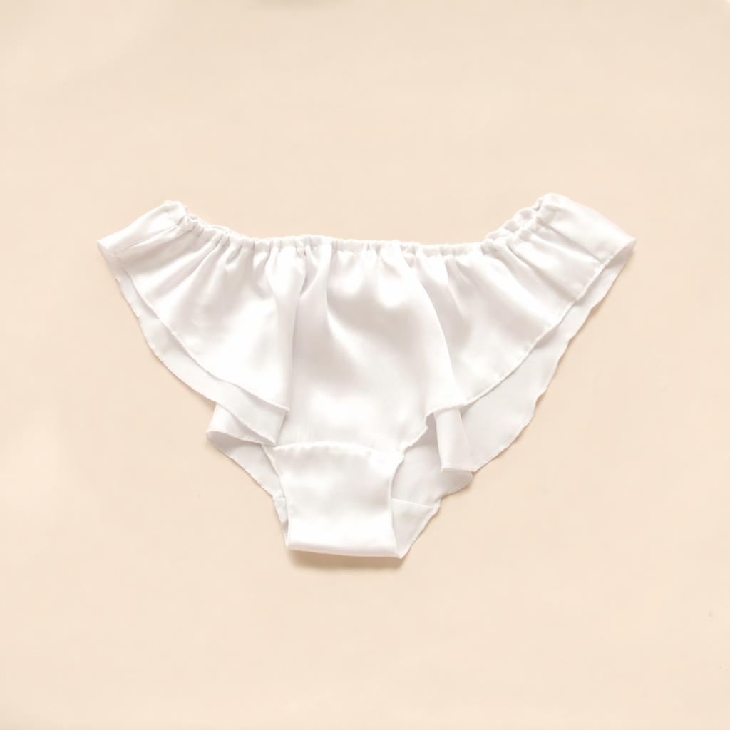 つるんとしたシルクサテンのフリルがおしりの上でゆれる、スイートピーの花びらをイメージしたショーツ。