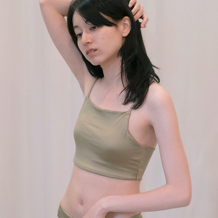 余計な装飾を極限まで無くしたデザインで、からだに吸い付くようにフィットし、タイトなボトムにもひびきにくくなっています。