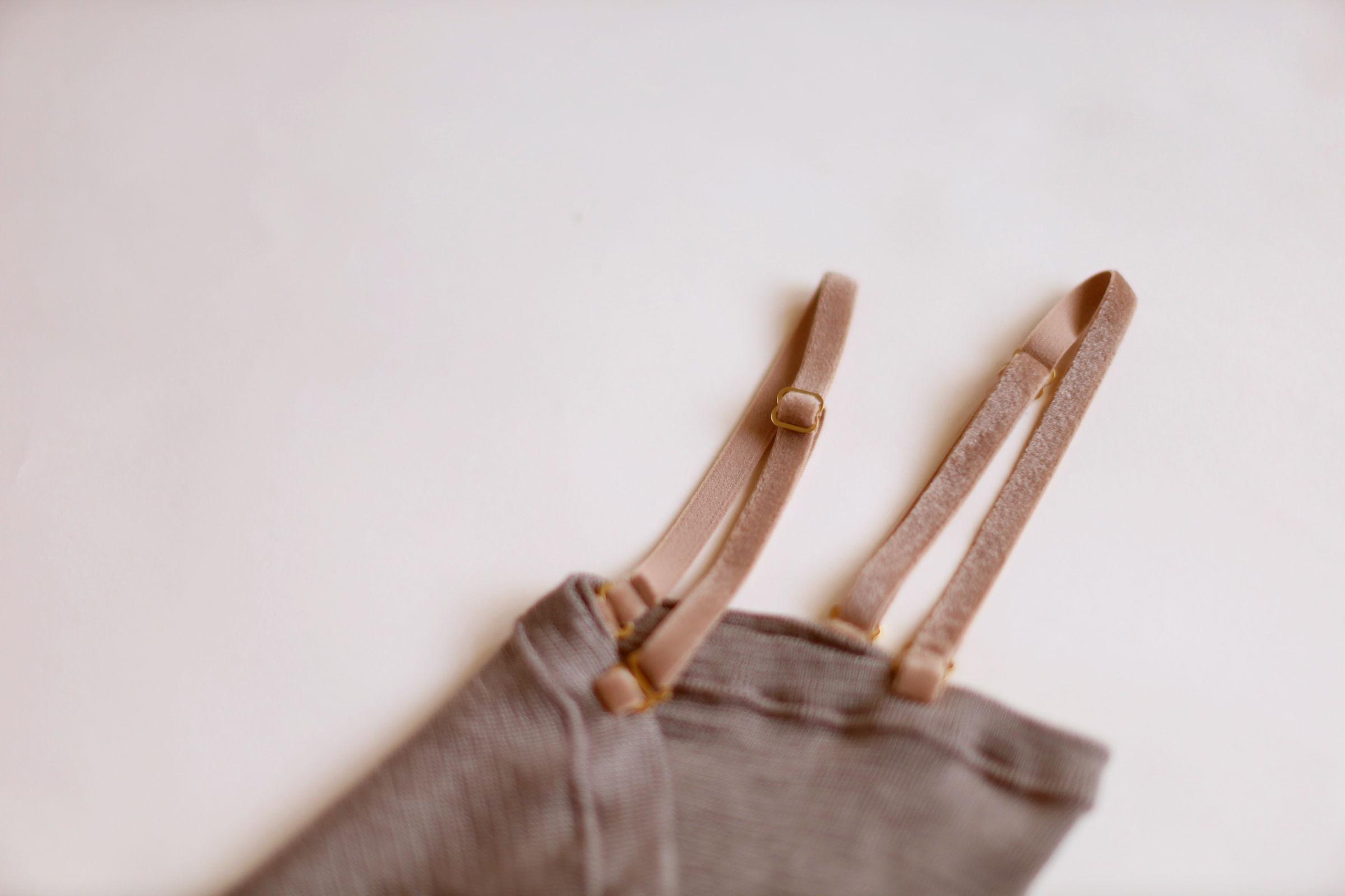 ストラップは、見せてもかわいく、下着っぽさのないバイカラーのベロア素材。