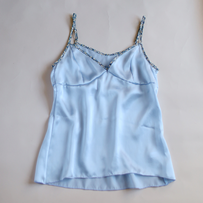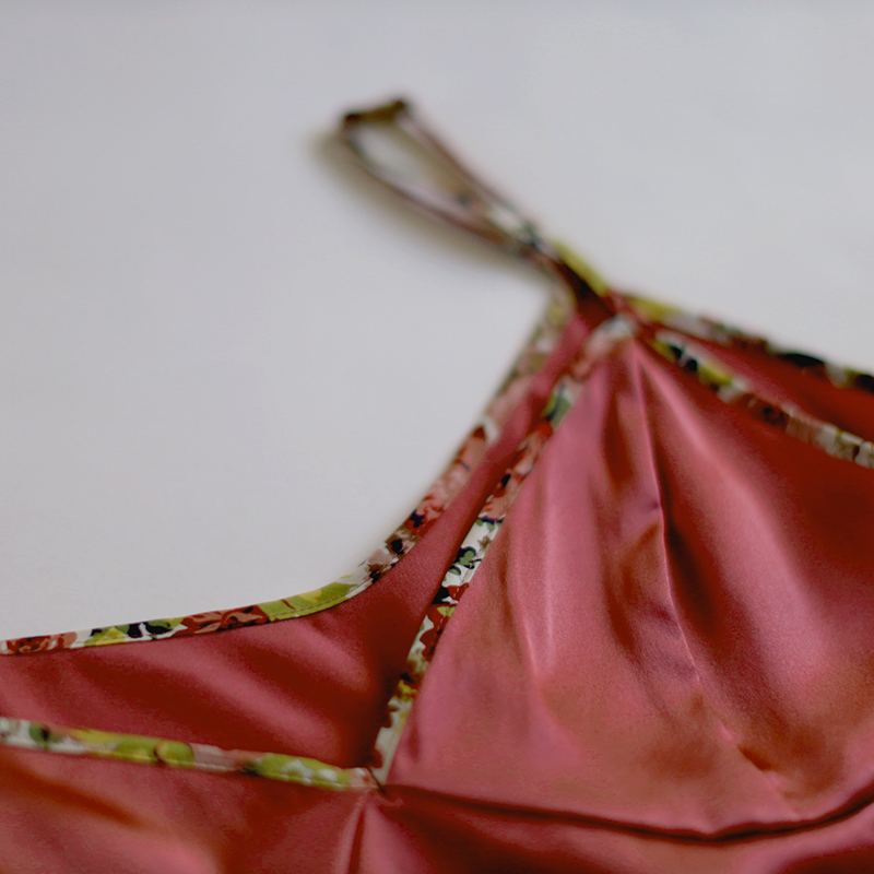 上品な光沢のつややかなシルクサテンにリバティ柄のパイピングが映える、シルク100%のサテンキャミソール。