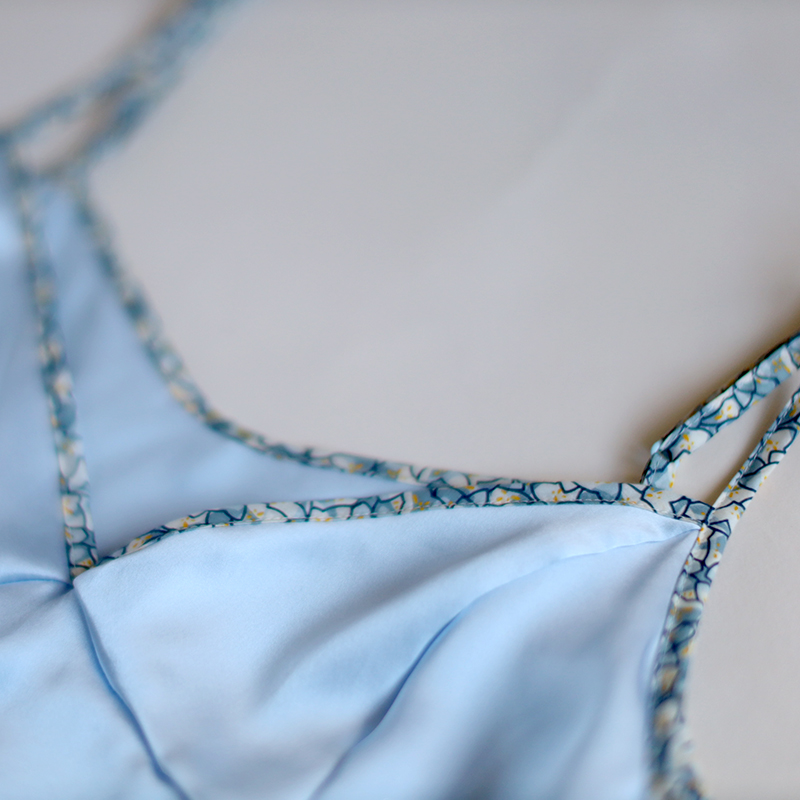 パイピングのリバティ生地には、「無地の発色の良いサテンに、細幅の繊細で高品質なプリントを合わせたい」というブランド創立時の明確なイメージが元になっている、思い入れのあるデザインです。