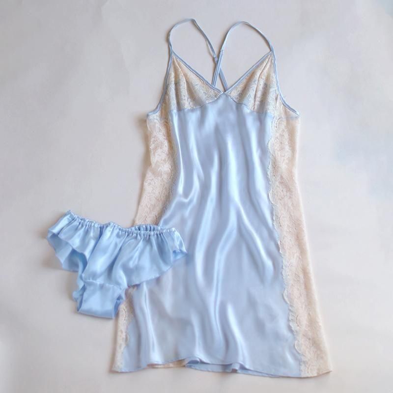 新色のフレアショーツと同じカラーのシルクレーススリップをセットにしました。スリップの「矢車草」カラーはフレアショーツのサックスブルーよりほんの少しお色が薄く仕上がっております。