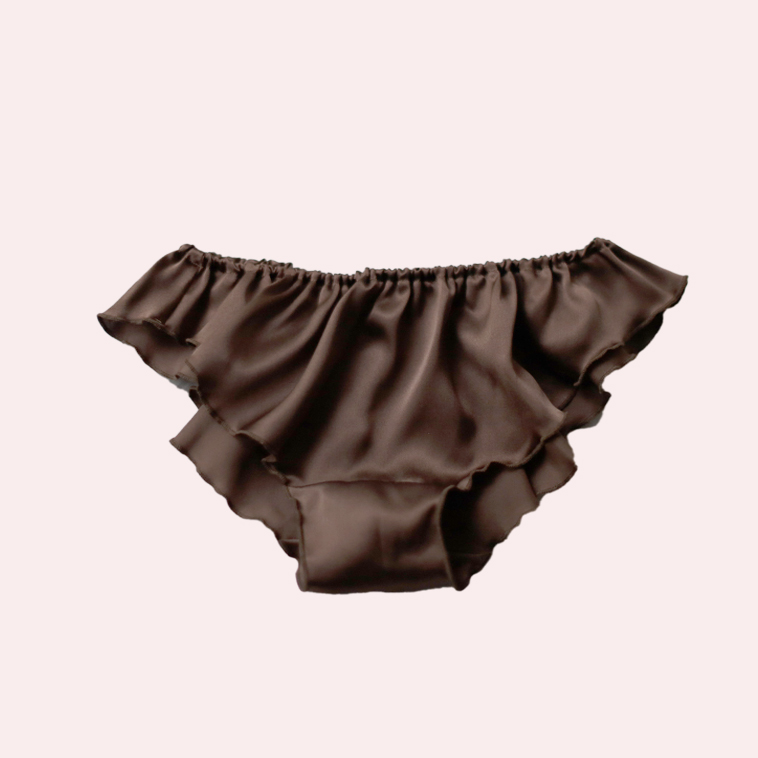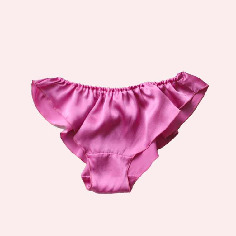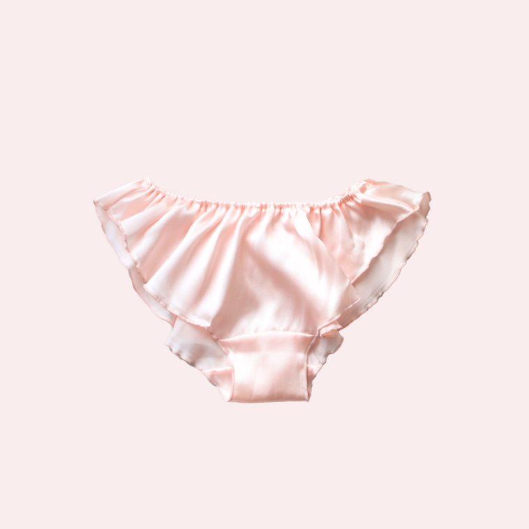 つるんとしたシルクサテンのフリルがおしりの上でゆれる、スイートピーの花びらをイメージしたショーツ。