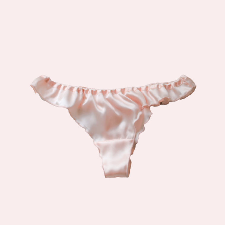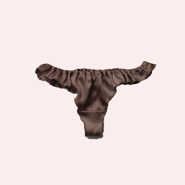 ゆったりとした履き心地が特徴のシルク100%のフリルタンガ、